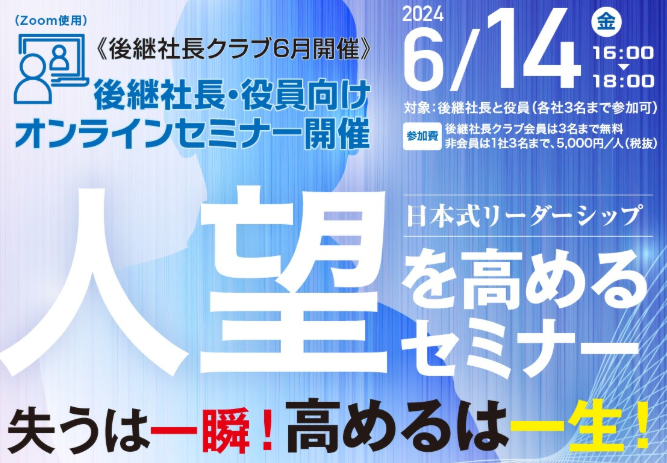 【オンライン開催】人望を高めるセミナー ー失うは一瞬! 高めるは一生!ー 開催日時 2024年6月14日(金) 16:00~18:00 会場 オンライン 詳細 料金(税込) 後継社長クラブ会員:無料 後継社長クラブ非会員:5,500円 定員 50名 今回のテーマは「人望」です。